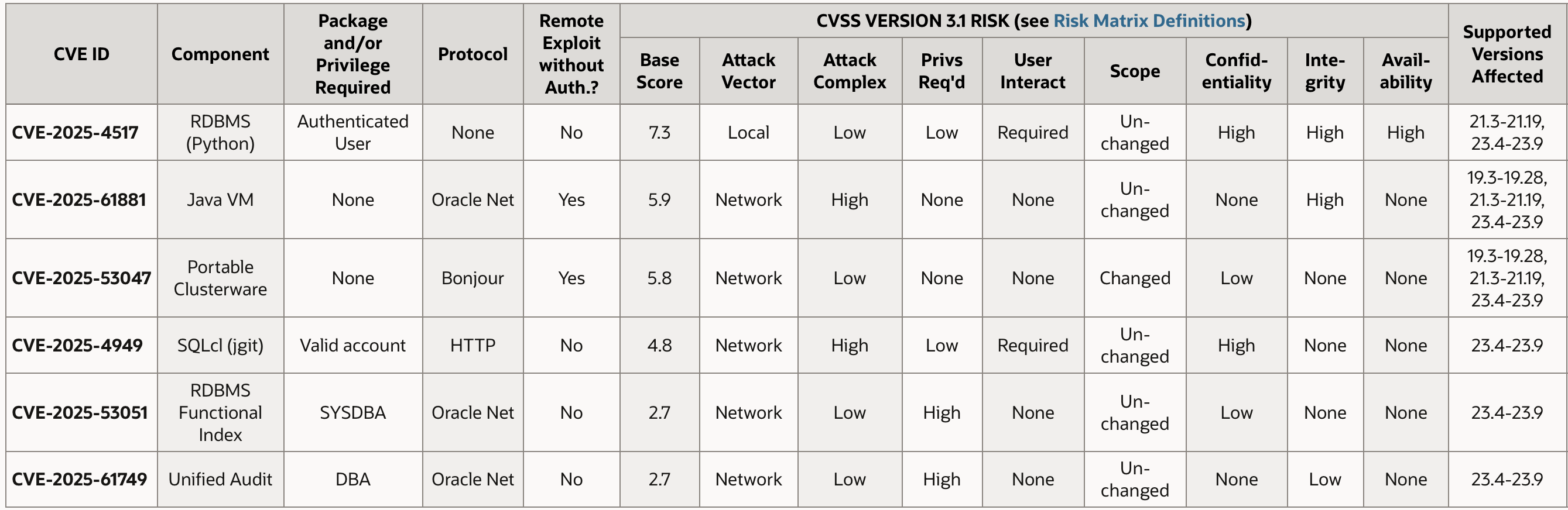 - CVE-2025-61881 ist nur relevant, wenn man die Datenbank mit Java (in der Datenbank - aka OJVM) betreibt. Wenn die Java Option nicht in der Datenbank installiert ist, ist diese gefährliche Lücke (weil ohne Authentifizierung über das Netzwerk ausnutzbar) nicht relevant.
